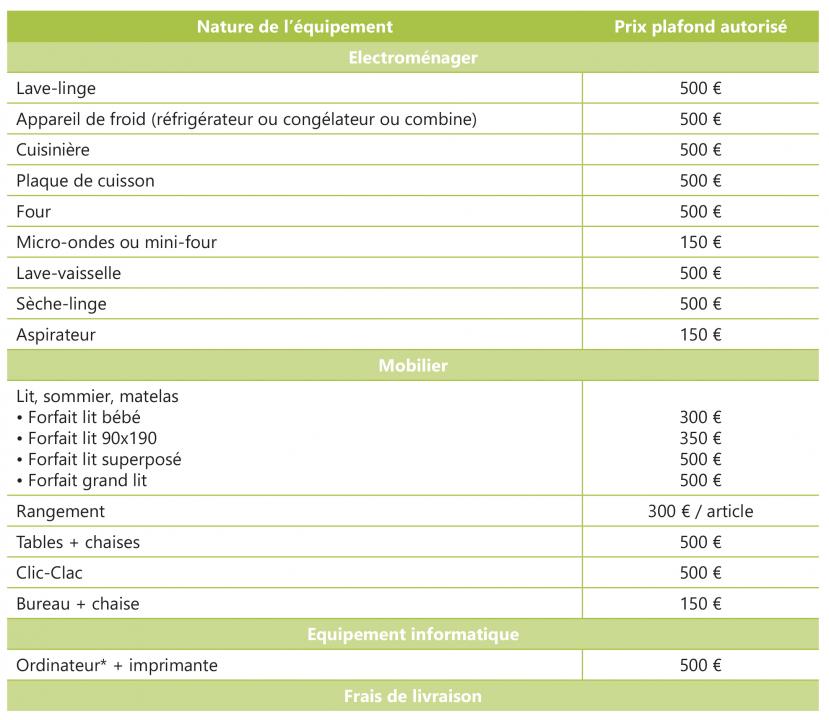 Ce prêt peut être sollicité pour l’acquisition d’appareils ménagers ou de mobilier neuf ou d’occasion de première nécessité (hors achat à un particulier et hors achat sur internet). Il existe des prix maximum par article.