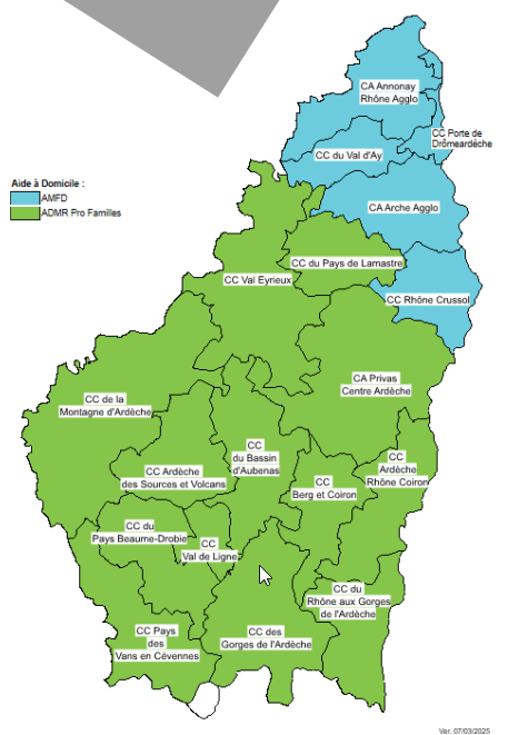 >>Par la fédération ADMR de l'Ardèche : Communauté d'Agglomération Privas Centre Ardèche / Communauté de Communes du Pays de Lamastre / Communauté de Communes Val Eyrieux / Communauté de Communes de la Montagne d'Ardèche / Communauté de Communes Ardèche des Sources et Volcans / Communauté de Communes du Bassin d'Aubenas / Communauté de Communes Berg et Coiron / Communauté de Communes Ardèche Rhône Coiron / Communauté de Communes du Pays Beaume-Drobie / Communauté de Communes Val de Ligne / Communauté de Communes du Rhône aux Gorges de l'Ardèche / Communauté de Communes des Gorges de l'Ardèche / Communauté de Communes Pays des Vans en Cévennes.