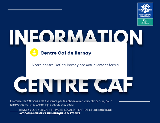 Votre centre Caf de Bernay est actuellement fermé. Retrouvez les canaux de contact de la Caf de l’Eure ainsi que les espaces France services proches de chez vous en cliquant ici.
