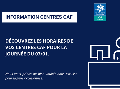Exceptionnellement, les accueils d'Evreux et de Vernon de la Caf de l’Eure seront fermés le 07/01 après-midi en raison des intempéries.