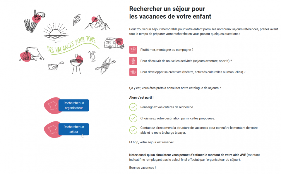 4. Puis en bas de la page, dans la partie «Rechercher un séjour pour des vacances enfants» cliquez sur «Rechercher un séjour»