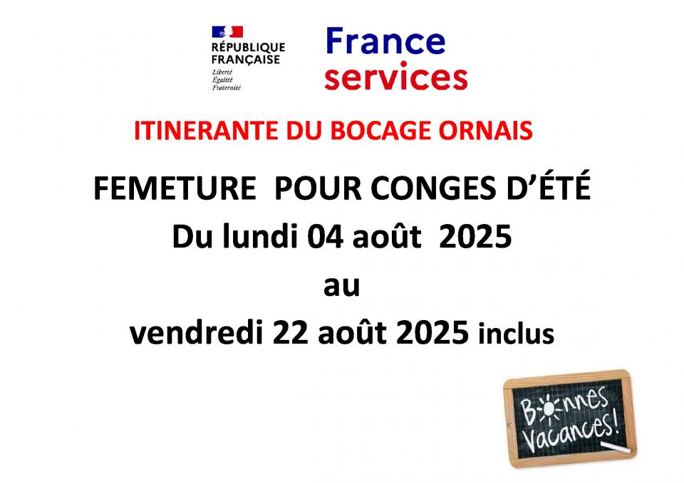 La Maison France Services itinérante du Bocage Ornais sera fermée du lundi 4 août au vendredi 22 août 2025 inclus