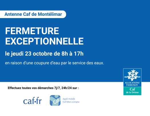 En raison d’une coupure d’eau annoncée par le service des eaux, l’antenne de la Caf située à Montélimar sera exceptionnellement fermée ce jeudi 23 octobre, de 8h à 17h.