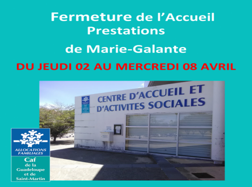 Nos centres d'accueil seront fermés le mardi 24 mars (Marie-Galante) et le jeudi 26 mars (tous les centres). Le caf.fr et l'appli mobile demeurent accessibles 24h/24 pour vous accompagner. Vous pouvez également vous rendre dans un des espaces France services du territoire.