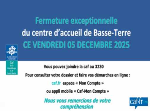Nous informons nos usagers qu'en raison d'une coupure d'électricité, le centre d'accueil de Basse-Terre est exceptionnellement fermé aujourd'hui, vendredi 05 décembre 2025.
