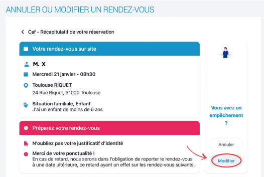 Lorsque vous êtes sur le récapitulatif de votre rendez-vous, si vous souhaitez le modifier, cliquez sur le bouton "modifier".