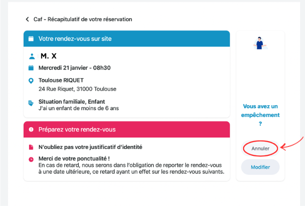 Lorsque vous êtes sur le récapitulatif de votre rendez-vous, si vous souhaitez l'annuler, cliquer sur le bouton "annuler".