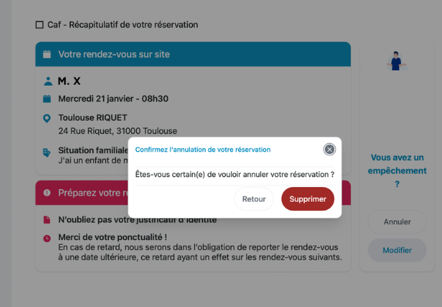 Vous pourrez ensuite annuler votre rendez-vous en cliquant sur le bouton "supprimer".