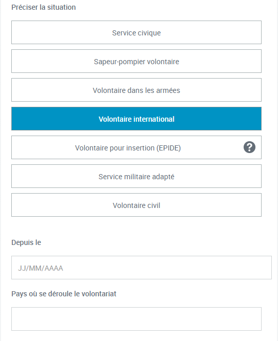 Je clique sur "autres situations" puis sur "volontariat". Je sélectionne ensuite le type de volontariat qui me concerne.