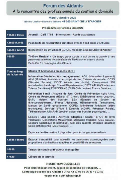 La CCSS participe au forum des aidants le mardi 7 octobre 2025 de 11h à 17h30 à la salle du Quartz route du Malzieu sur Saint-Chély-D'apcher.