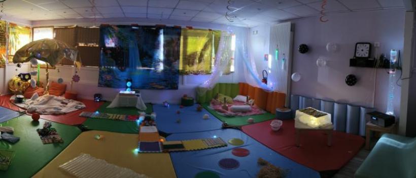 Le Snoezelen est une activité vécue dans un espace spécialement aménagé, éclairé d'une lumière tamisée, bercé d'une musique douce, un espace dont le but est de recréer une ambiance agréable.