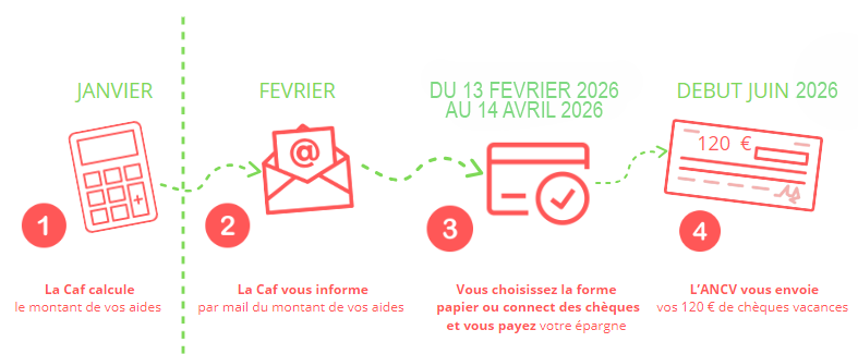 Début juin 2026, les familles recevront des chèques vacances de 120 € sous la forme d’un chéquier papier classique ou de manière dématérialisée sur smartphone (chèques connect), selon leur choix.