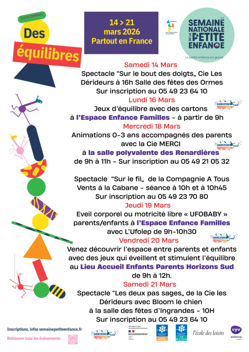 | Poitiers Auchan Sud | 21 mars | A la recherche de l'équilibre : action en santé publique sur le thème de l'acquisition de la marche chez le jeune enfant par les étudiantes puéricultrices - samedi 21 mars de 14h30 à 17h à Auchan Sud (porte Val de Vienne) |
