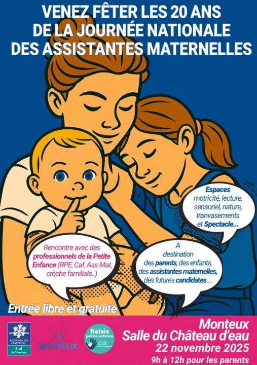 Le samedi 22 novembre 2025, la Caf, les Relais Petite Enfance (RPE) et leurs partenaires vous invitent à célébrer les 20 ans de la Journée Nationale des Assistantes Maternelles à la Salle du Château d’eau de Monteux.