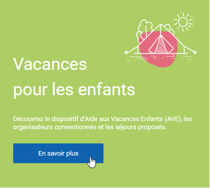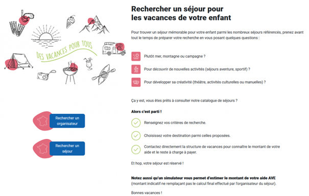 Choisissez le séjour pour votre enfant et contactez la structure organisatrice : Vous devez indiquer à la structure que vous êtes bénéficiaire de l’AVE et lui communiquer votre numéro allocataire afin qu'elle puisse consulter et calculer votre aide. Elle calculera ensuite le montant restant à votre charge.