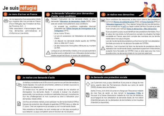 Je me rapproche d'une association d'aide aux migrants dès mon arrivée en France (Forum Réfugiés, Agir, Fondation de Nice, Api Provence, ALC,...) afin d'être aidé(e) dans mes démarches administratives pour bénéficier des aides de l'Etat et de la caisse d'Allocations familiales des Alpes-Maritimes.