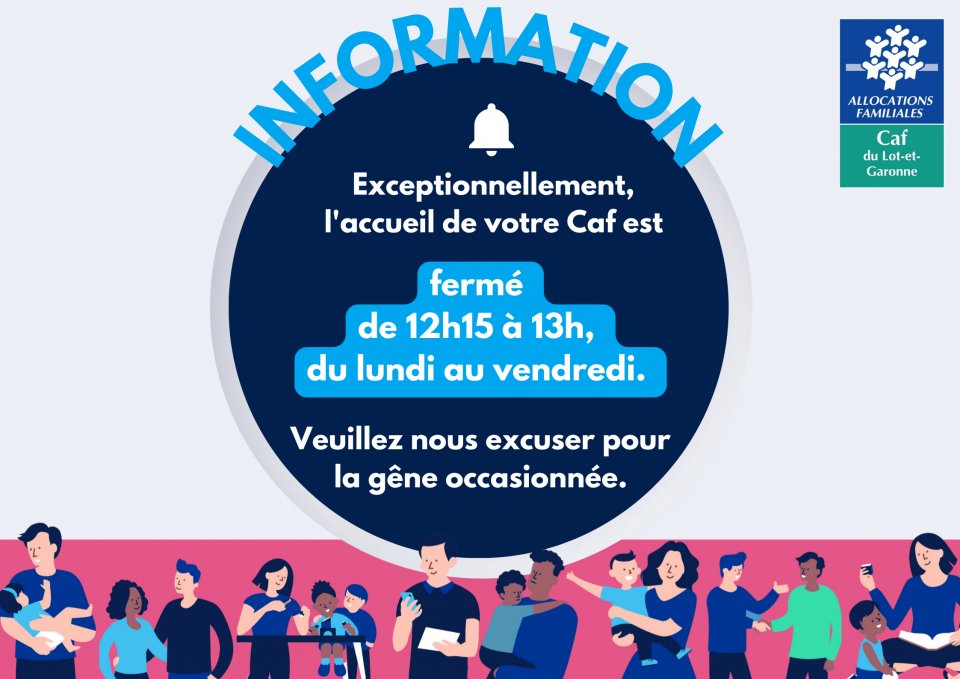 L'accueil de votre Caf est fermé du lundi au vendredi de 12h15 à 13h.