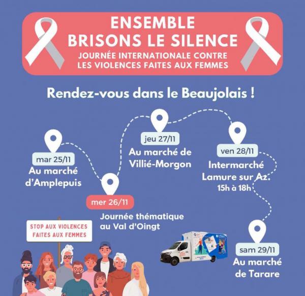 Le bus de l’Udaf (Union départementale des associations familiales) du Rhône et la Métropole de Lyon et de la fondation des Amis du jeudi dimanche (AJD) défilera du 25 au 29 novembre sur les marchés d'Amplepluis, de Villié-Morgon, de Tarare, à l'Intermarché de Lamure-sur-Azergues et au Val d'Oingt.