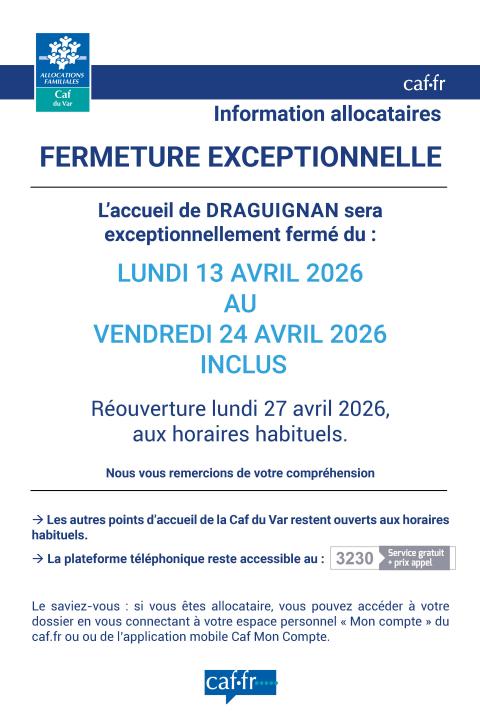 L’accueil de Draguignan sera fermé du lundi 13 avril au vendredi 24 avril 2026 inclus (pendant les vacances scolaires).