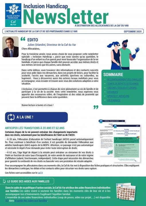Cette lettre d’informations met en lumière les initiatives varoises portées par nos partenaires et soutenues par la Caf, afin d’accompagner au mieux les familles, les aidants et les personnes en situation de handicap.