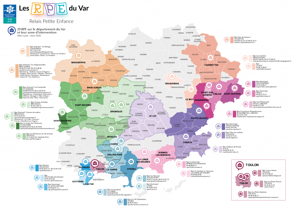 Vous pouvez consulter la liste des Relais Petite Enfance présents sur le département du Var sur le site monenfant.fr, ainsi que sur la cartographie.
