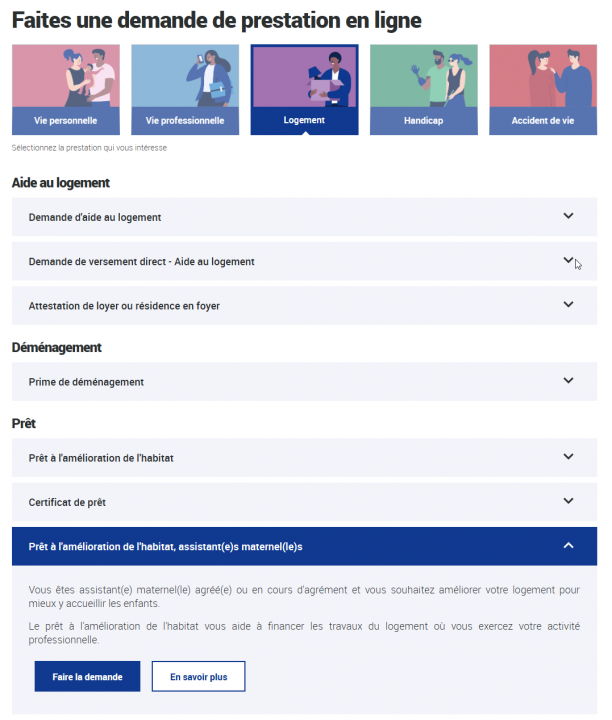 - vous connectez à votre espace personnel Mon Compte ou vous créer un compte, et faire la demande de Prestation " Prêt à l'amélioration d' l'habitat, assistant(e)s maternel(le)s " et joindre l’ensemble des pièces justificatives demandées.