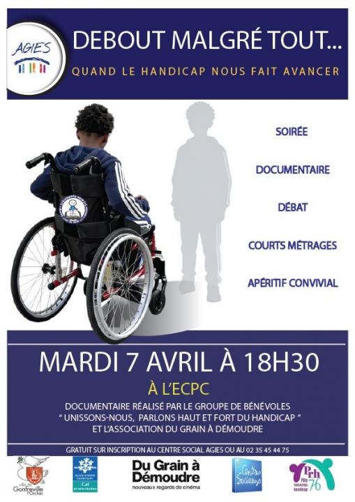 7 avril : Debout malgré tout...Quand le Handicap nous fait avancer : Participer à la soirée de diffusion de ce documentaire à l'Espace Culturel de la pointe de Caux. En savoir plus