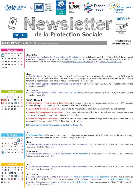 France Travail, la MSA Provence Azur, la CPAM du Var, la CARSAT Sud Est et la Caf du Var s'associent pour vous proposer une newsletter commune.