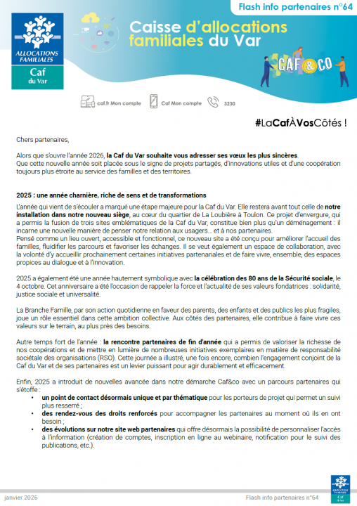 Retrouvez toutes les actualités de la Caf du Var dans le Flash Info Partenaires de janvier 2026.