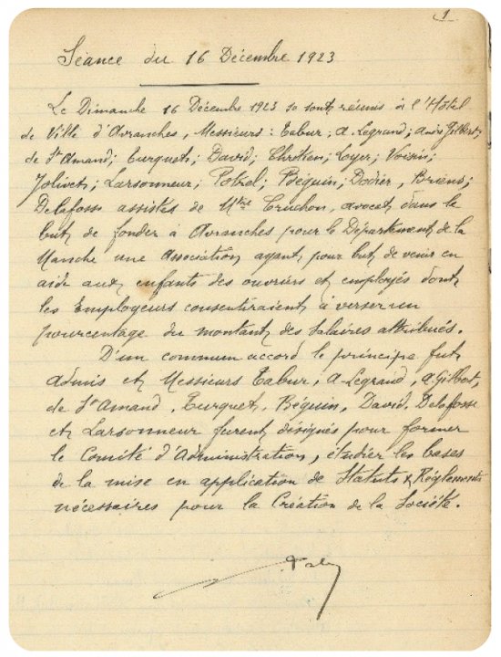En 1924, le conseil adopte les statuts de l'association de la caisse mutuelle avranchinaise d'allocations familiales pour le département de la Manche. Le 20 mars, un premier salarié est recruté : M. Jérôme, ancien chef de gare devient secrétaire pour 148 Frs par mois. L'activité du bureau est concentrée sur le recrutement d'entreprises adhérentes.