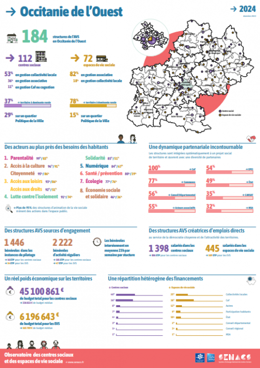 Le poster "Observatoire des centres sociaux et des espaces de vie sociale – Occitanie de l’Ouest (2024)" constitue un outil de synthèse permettant de visualiser l’implantation et les caractéristiques des structures d’animation de la vie sociale sur le territoire. Il présente les données actualisées de l’année 2023 concernant les centres sociaux (112) et les espaces de vie sociale (72), en précisant leur mode de gestion, les thématiques prioritaires d’intervention ainsi que les dynamiques partenariales et économiques associées. Ce document met en évidence l’engagement des acteurs institutionnels, notamment la CAF, dans l’accompagnement et le développement de ces structures, véritables leviers de cohésion sociale et de participation citoyenne à l’échelle locale.