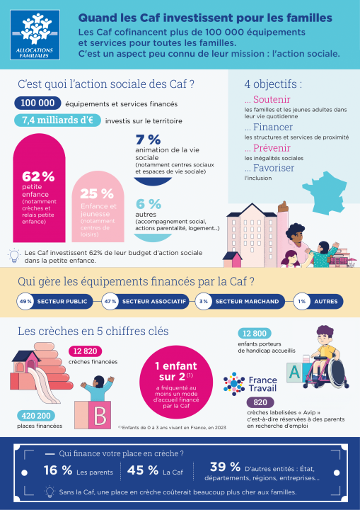 Chaque année, elles investissent 7,4 milliards d’euros et cofinancent plus de 100 000 équipements et services pour soutenir les familles, ou non, partout en France. Crèches, centres de loisirs, centres sociaux, médiation familiale, aide à domicile… Ces dispositifs visent à prévenir les inégalités, favoriser l’inclusion et accompagner les familles dans les moments clés de leur vie.