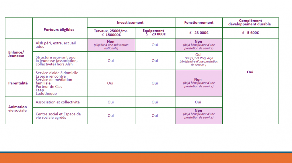 - Un co-financement est obligatoire : au moins 20 % sur fonds propres et/ou par d’autres financeurs publics (les financeurs publics sont sollicités en priorité, la Caf intervient en complément) ;