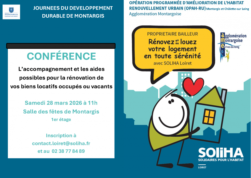 Propriétaires bailleurs, la Caf vous informe que Soliha vous propose une conférence sur L'accompagnement et les aides possibles pour la rénovation de vos biens locatifs occupés ou vacants le samedi 28 mars à 11h à Montargis.