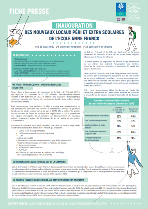 La Caf de l’Hérault et la Ville de Saint-André-de-Sangonis inaugurent les nouveaux locaux péri et extrascolaires intégrés à l’extension de l’école Anne Franck. Ce projet permet de regrouper les enfants d’âge élémentaire sur un même site, facilitant l’organisation des familles, renforçant la cohérence éducative et optimisant le travail des équipes d’animation.