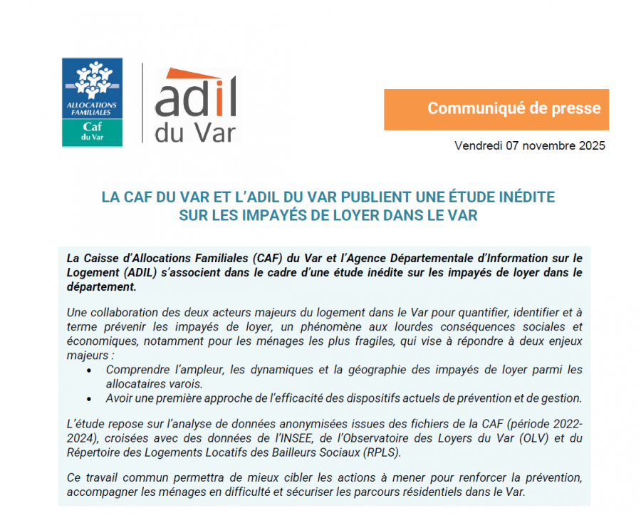La Caisse d’Allocations Familiales (CAF) du Var et l’Agence Départementale d’Information sur le Logement (ADIL) s’associent dans le cadre d’une étude inédite sur les impayés de loyer dans le département.