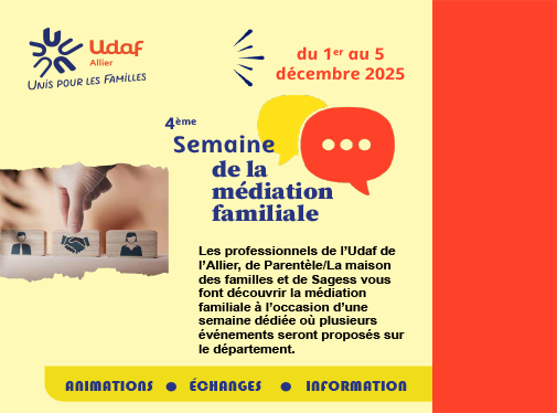 Pour la 4ème année consécutive l’Udaf 03, Parentèle, SAGESS et Agir-Arrco Auvergne s’associent et vous proposent la semaine de la médiation familiale du 1er au 5 décembre 2025.
