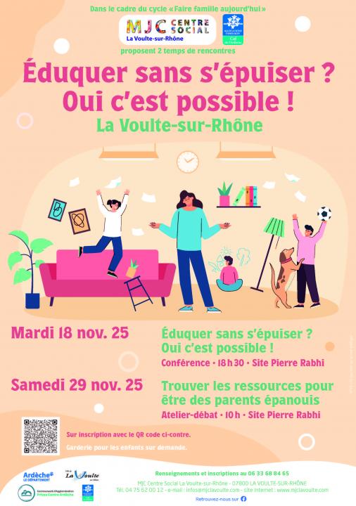 Être Parent aujourd'hui, un vrai défi ! Comment concilier vie de famille, vie professionnelle, et personnelle sans s'oublier. La MJC Centre Social de la Voulte-sur-Rhône, en partenariat avec la Caf de l'Ardèche organise deux temps d'échanges sous forme de conférence débat et d'atelier, afin d'aborder ensemble les clés pour retrouver le plaisir d'être en famille.