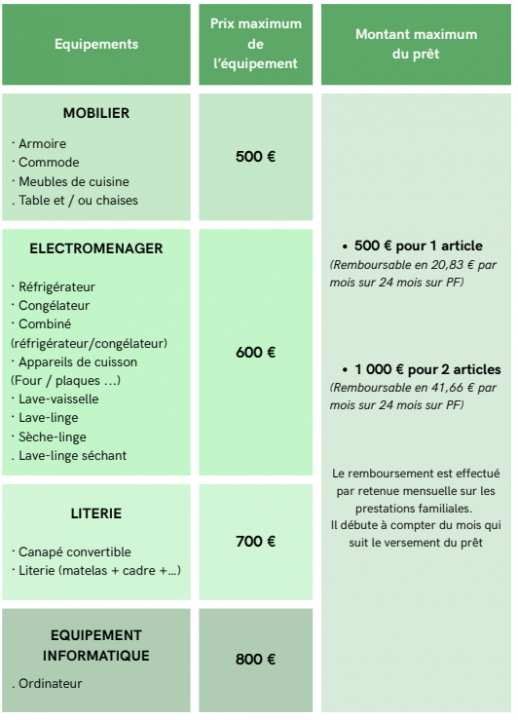 - Le prêt est remboursable en 24 mensualités maximum, prélevées sur les prestations familiales dès le 2ème mois suivant le paiement du prêt