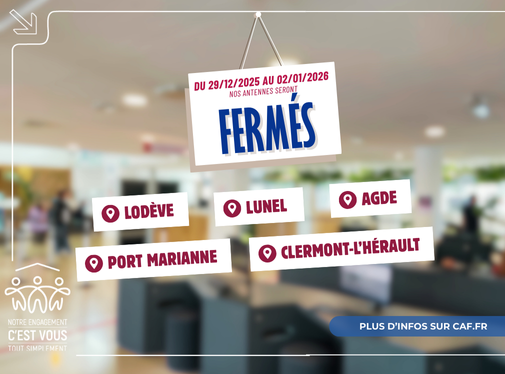 Dans le cadre de deux sessions d’opération production, certaines antennes seront exceptionnellement fermées : ✅ Vendredi 12 décembre >> Antenne de Sète >> Antenne de Lunel ✅ Mercredi 17 décembre >> Antenne de Port Marianne >> Antenne de Lodève Nous vous invitons à privilégier nos services en ligne sur caf.fr ou via l’application Caf – Mon Compte pendant ces journées. Merci de votre compréhension.
