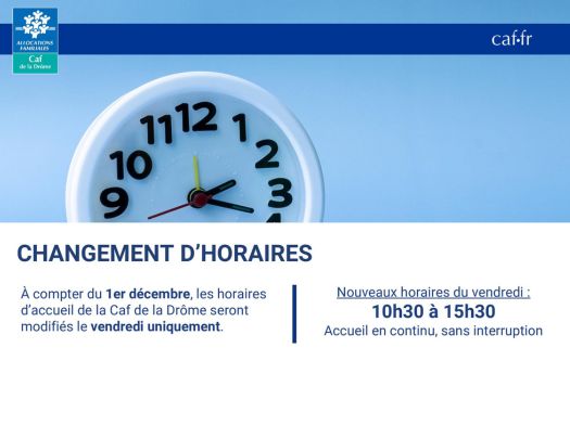 Nous vous informons qu'à compter du 1er décembre, les horaires d'accueil du siège de la Caf de la Drôme de Valence seront modifiés le vendredi uniquement.