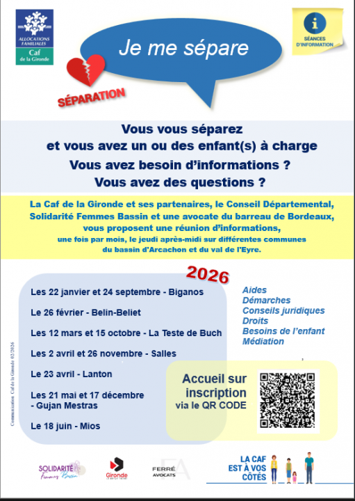 La Caf de la Gironde et ses partenaires, le Conseil Départemental, Solidarité Femmes Bassin et une avocate du barreau de Bordeaux, vous proposent une réunion d’informations, une fois par mois, le jeudi après-midi, sur différentes communes du bassin d'Arcachon et du val de l'Eyre.