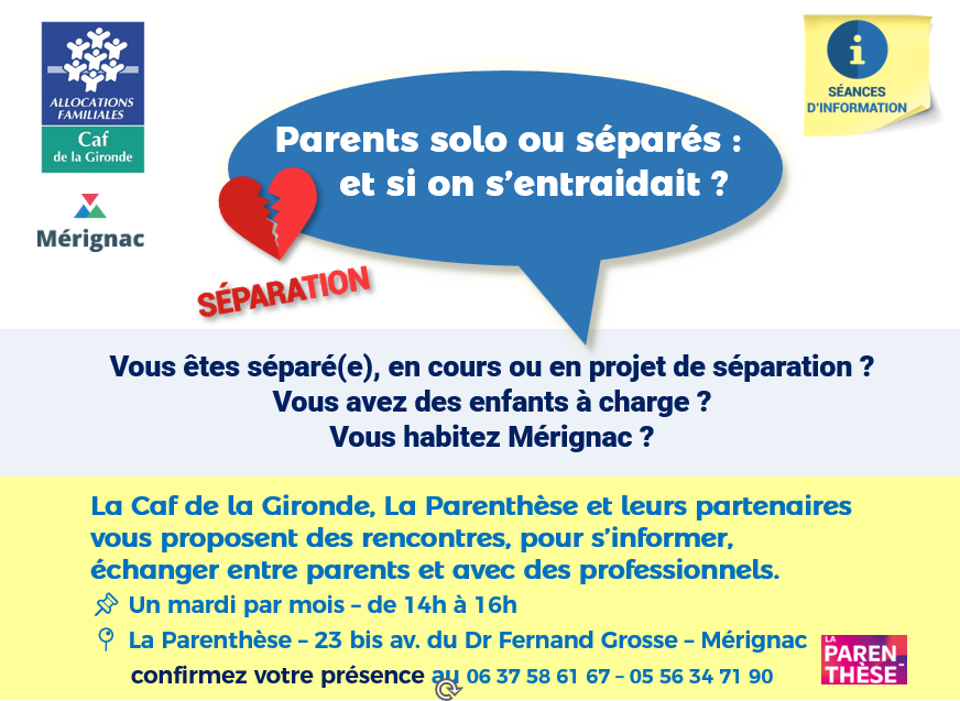 La Caf de la Gironde, la Ville de Mérignac, La Parenthèse et leurs partenaires vous proposent des rencontres, pour s’informer, échanger entre parents et avec des professionnels.