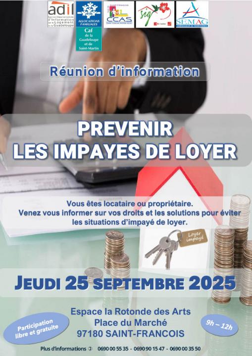 La Caf et ses partenaires invitent les locataires et propriétaires à une réunion d'information sur les impayés le jeudi 25 septembre de 9h à 12h à Saint-François, Place du Marché.