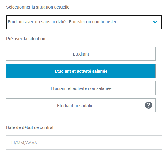 Si vous êtes doctorant, que vous ne disposez pas d’un contrat doctoral (de droit privé ou de droit public) et que vous exercez une activité en parallèle (job étudiant), cliquez sur la case « Etudiant avec ou sans activité, boursier / non boursier ». Puis, dans un second temps cliquez sur la case « Etudiant et activité salariée ».