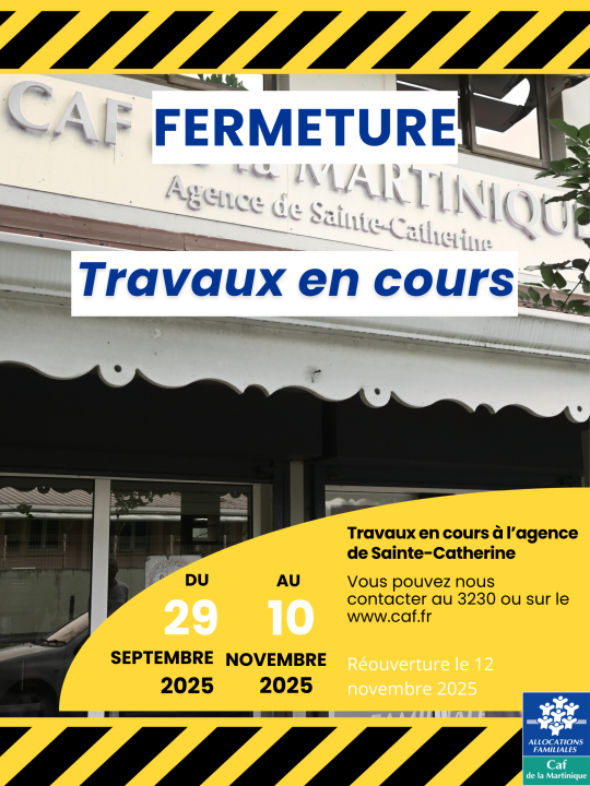 L’agence de Sainte - Catherine sera fermée du 29 septembre au 10 novembre inclus. Pendant cette période, nous vous invitons à effectuer vos démarches en ligne sur le www.caf.fr ou via l’application mobile Mon Compte. Pour toute question urgente, vous pouvez également contacter notre service au 32 30 (prix d’un appel local).