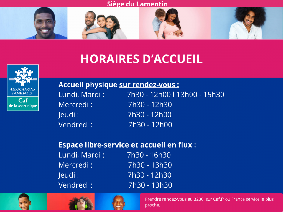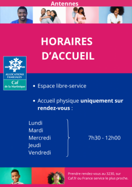 La Caisse d’Allocations Familiales de la Martinique informe ses allocataires de l’évolution de ses modalités d’accueil à compter du lundi 20 avril 2026. Dans les antennes du Marin, de Rivière - Salée et de Sainte - Catherine, l’accueil du public s’effectue de 7h30 à 12h00, uniquement sur rendez-vous.