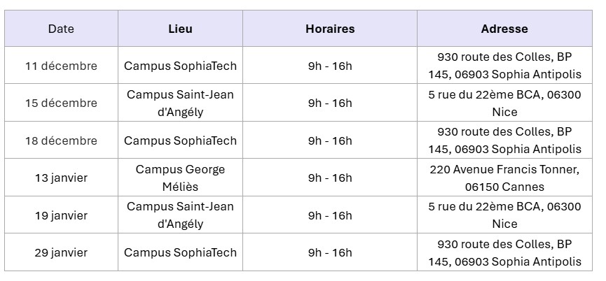 🔹Lundi 8 septembre 2025 - 10h > 17h Centre AFPA 244 Route de Turin - 06300 Nice | 🔹Jeudi 11 septembre 2025 - 17h > 20h Le Before de ta rentrée Maison de l'étudiant - 5 avenue François Mitterrand - 06300 Nice | |