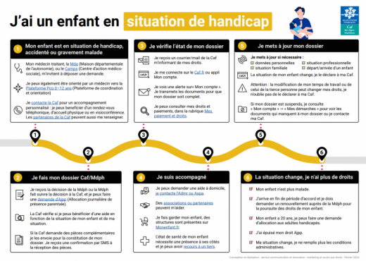 Le parcours "J'ai un enfant en situation de handicap" va vous permettre de découvrir les différentes démarches à accomplir pour bénéficier d'aides financières et d'un accompagnement personnalisé.