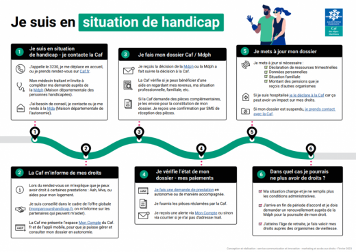 Le parcours "Je suis en situation de handicap" vous permet d’avoir une vision d’ensemble de l’offre de services proposée par la Caf et ses partenaires, en fonction de votre situation.